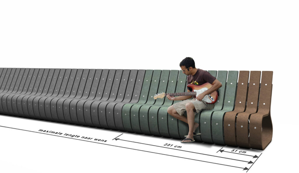 Wat deze bank zo bijzonder maakt, is de organische vorm die losstaat van traditionele materialen als hout, staal of beton. Ons uitgangspunt was een bank met een unieke, eigentijdse vormgeving, vervaardigd uit gerecycled kunststof. Het resultaat is een uniek design met bijzondere eigenschappen. Een van de meest opvallende: de breedte van de bank is onbeperkt schaalbaar – van een compacte stoel tot een lange, golvende bank.